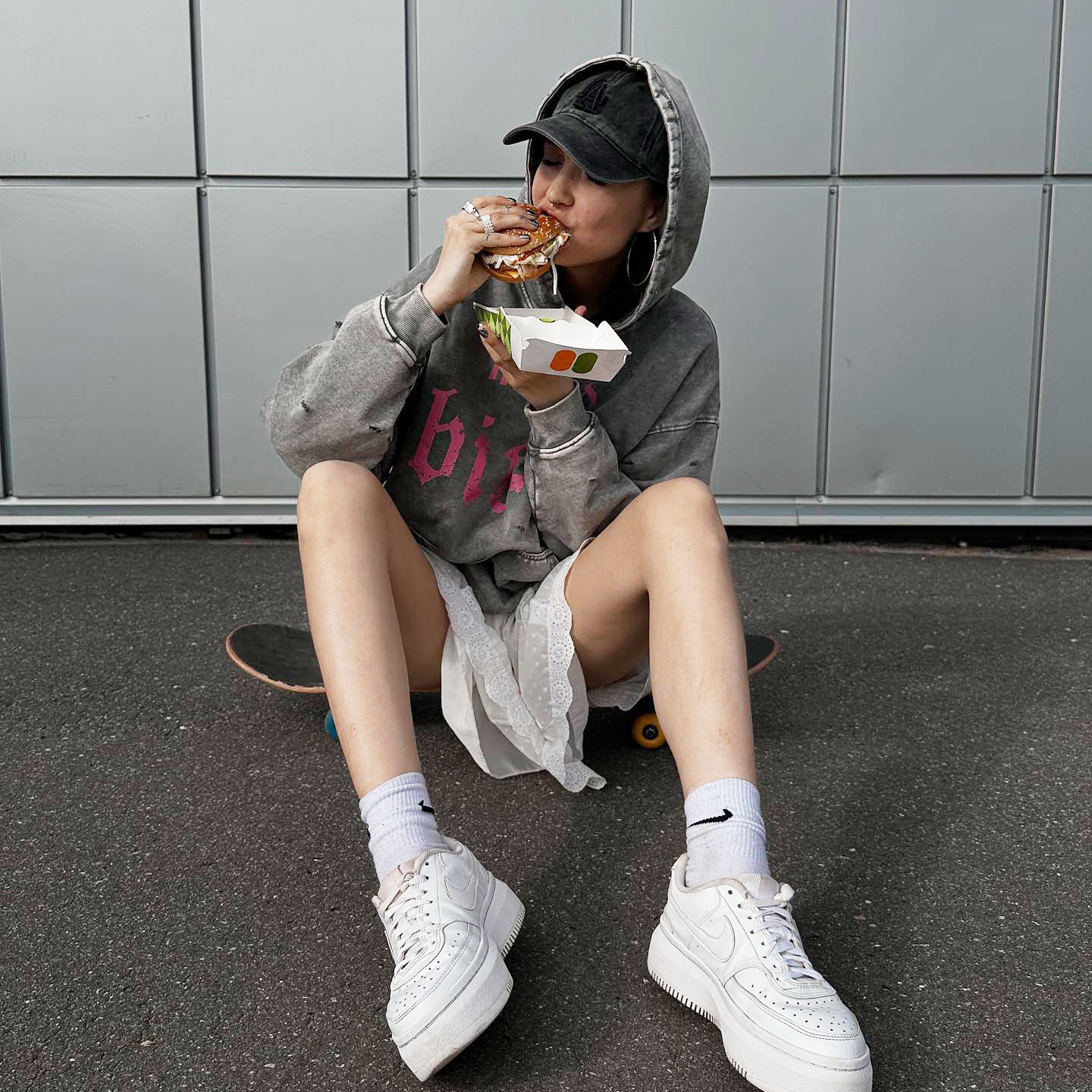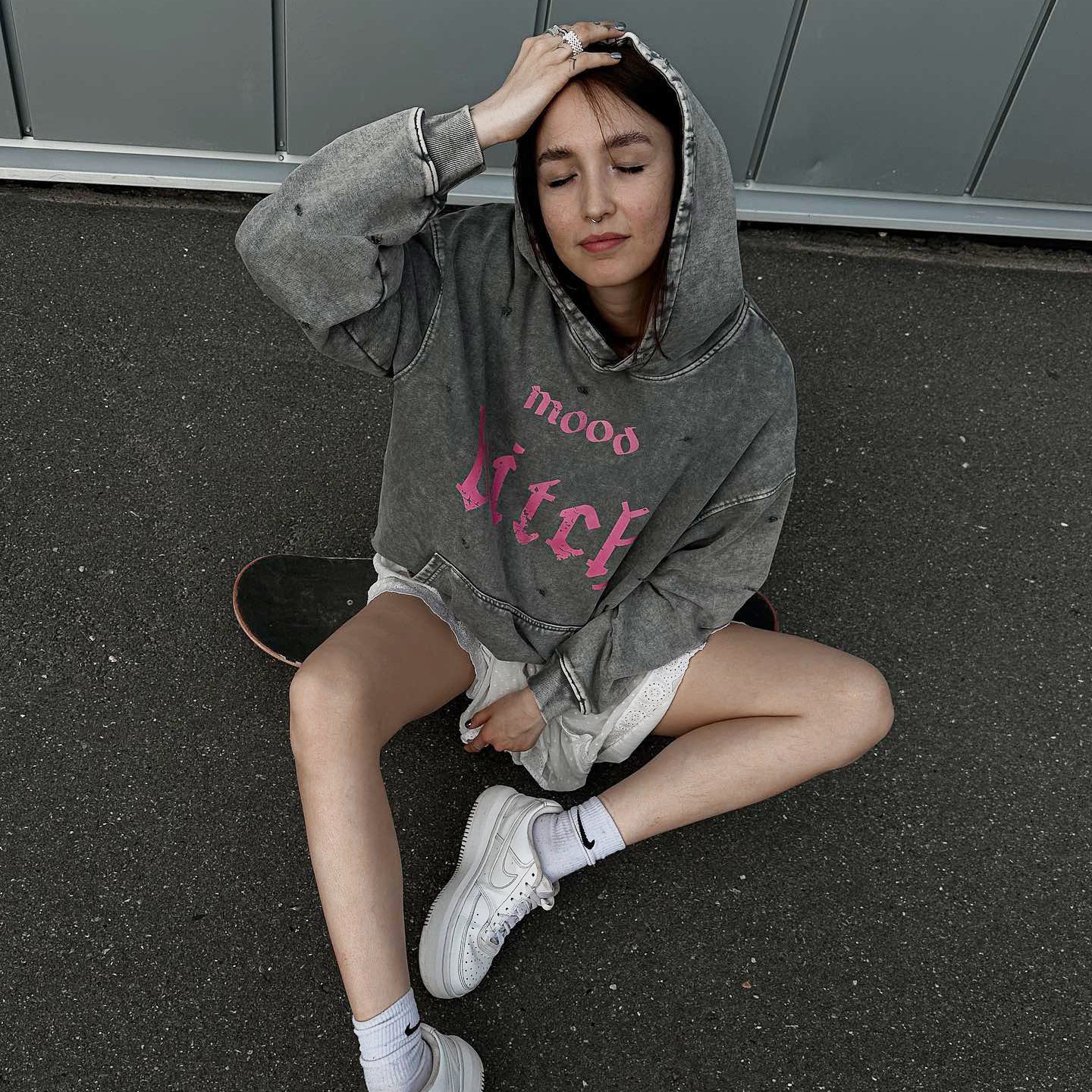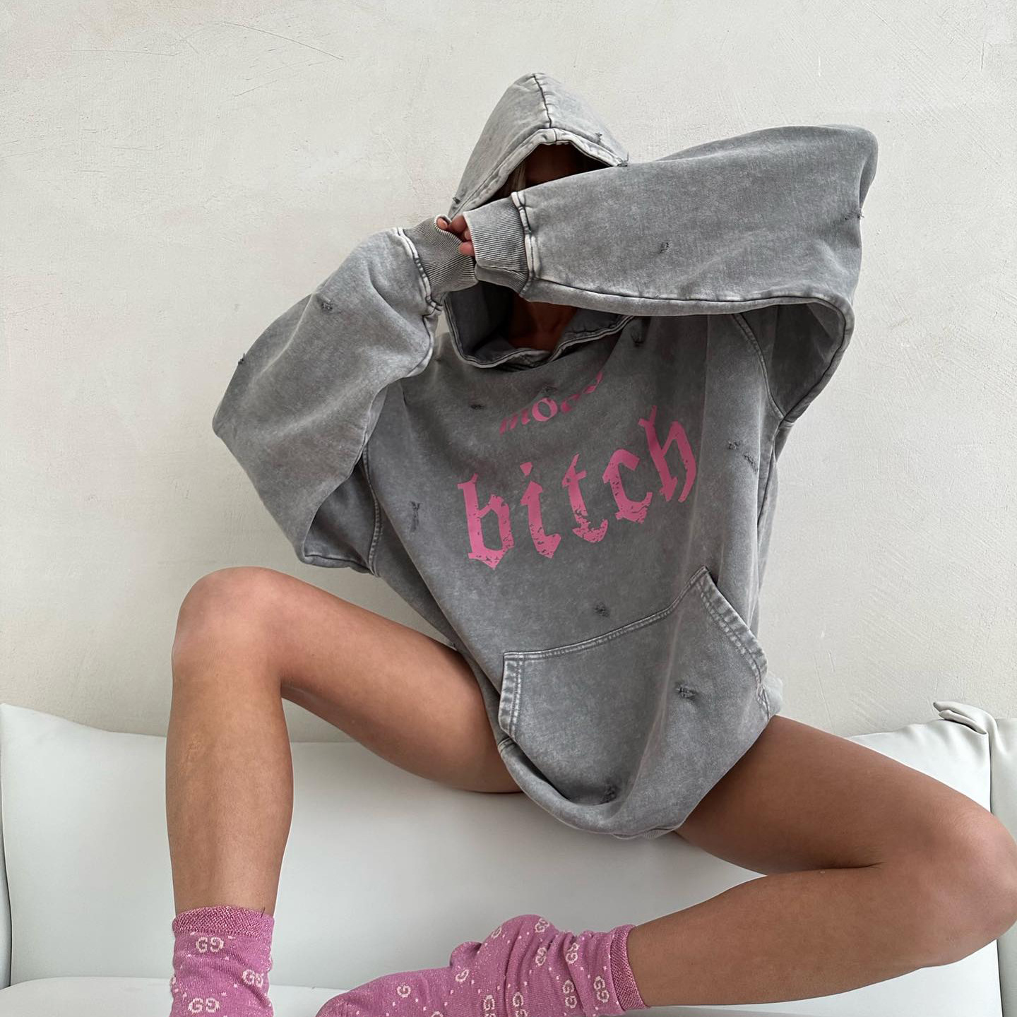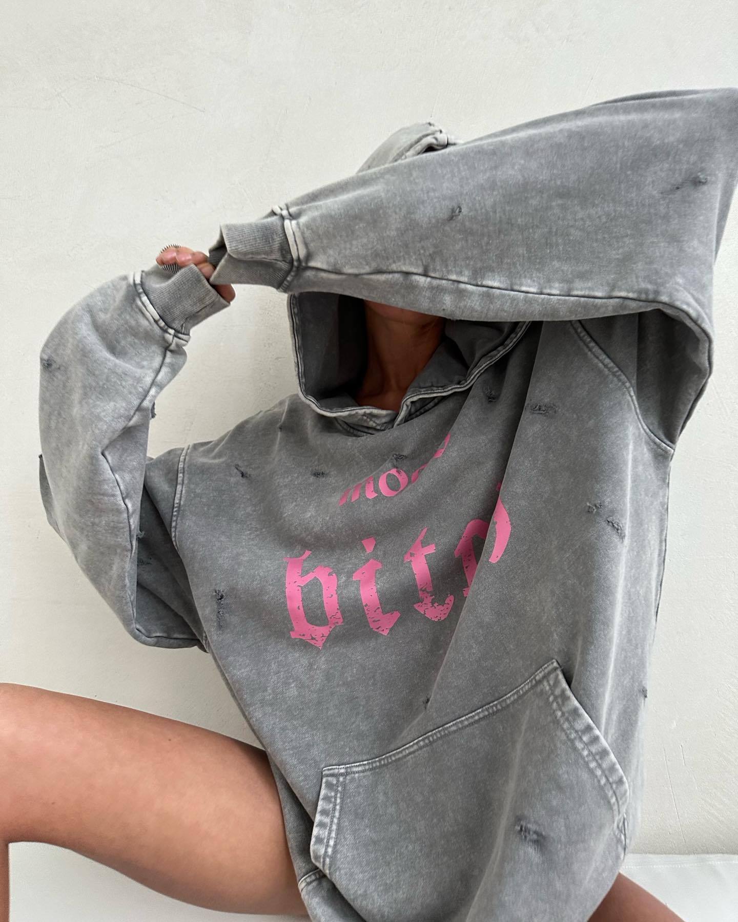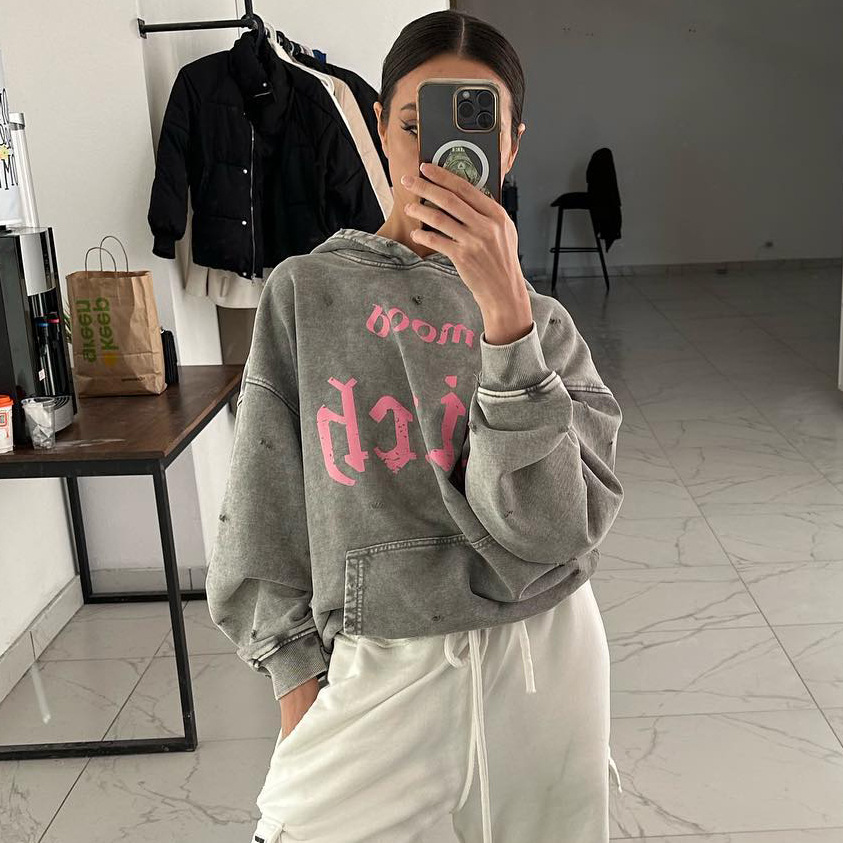 Retro washed water vintage hooded sweatshirt for women, autumn and winter jacket for women, American high street loose casual tattered top for women